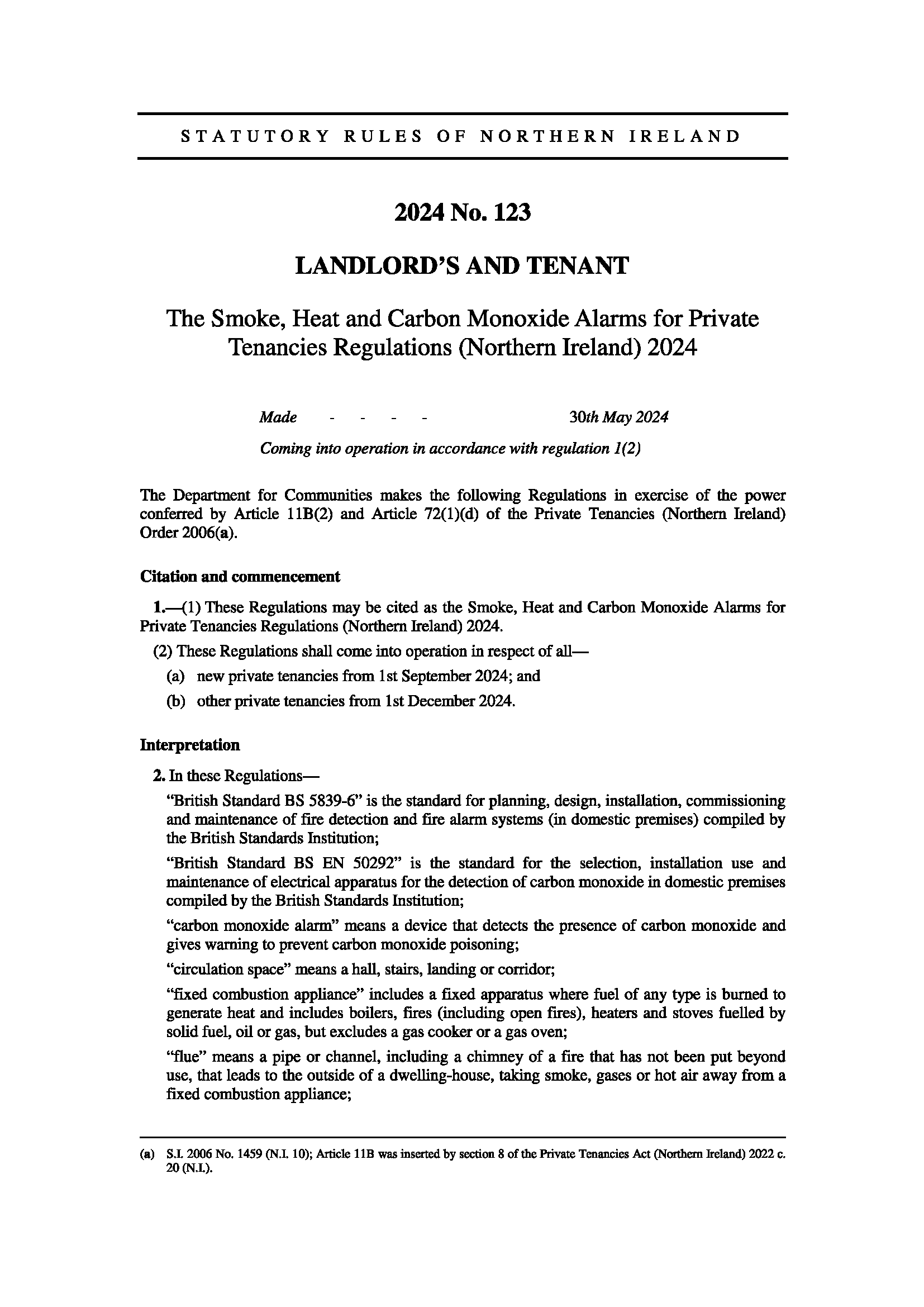Changes to The Smoke, Heat and Carbon Monoxide Alarms for Private Tenancies Regulations (Northern Ireland) 2024 made on 30 May 2024